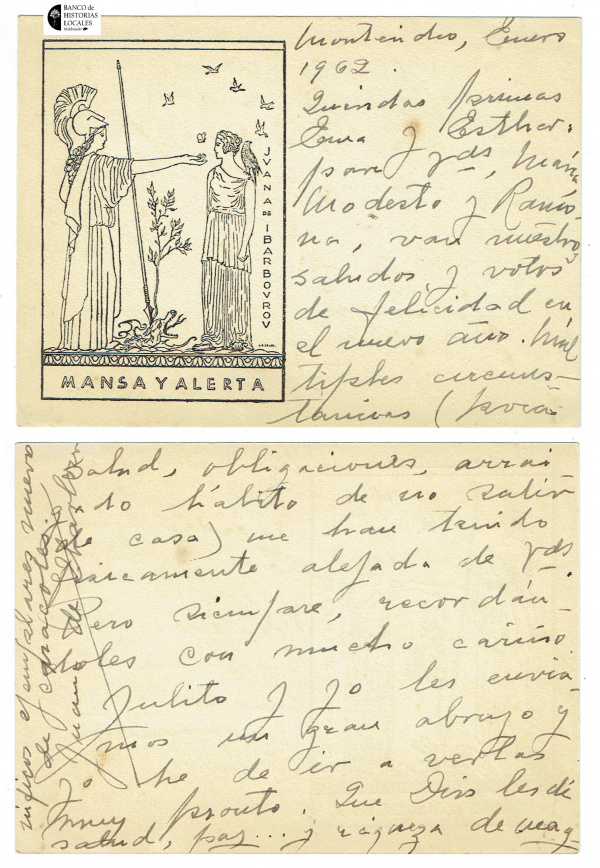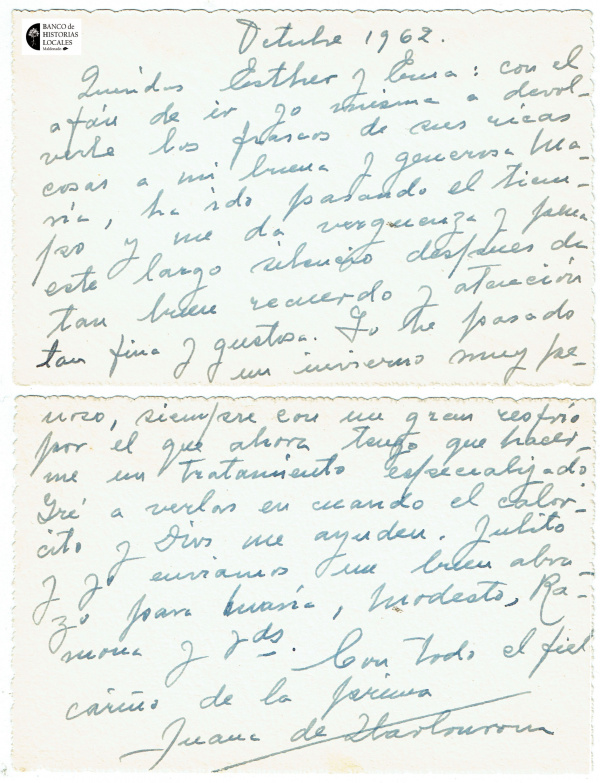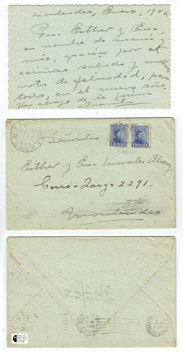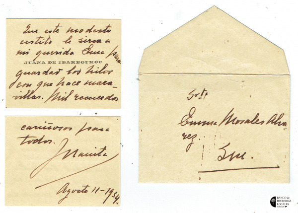 1934. La tarjeta de visita de Juana, de 7 x 5.5 cm, y el sobrecito que la contiene.