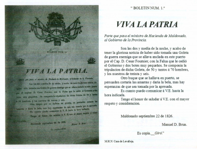Dice: "El Comandante Militar de Maldonado é interino del Departamento, inspirado de la mayor complacencia tiene la satisfacción de dirigirse a su jefe el señor Coronel de milicias y comandante de dicho Departamento, don Leonardo Olivera, instruyéndole de la brillante jornada que a las 11 y 1/2 ó 12 de la noche de este día tuvo lugar en las márgenes del puerto de Maldonado. El capitán del corsario que armó en esta Plaza Fournier auxiliado con dos botes y 35 hombres de tripulación armados, sorprendieron a la goleta de guerra Imperial nombrada Paulistana que existía anclada en este puerto, tomando prisioneros a su Comandante Antonio Carlos Ferreyra, tres oficiales que con la demás tripulación componían el número de 52 hombres, siendo entre estos herido dicho Ferreyra y dos marineros que estaban de centinela, y por la parte de la del corsario ninguno absolutamente."