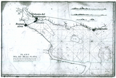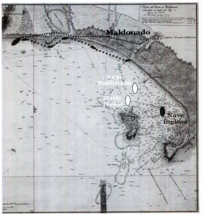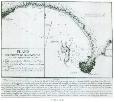 "Día 14 [setiembre] Ha llegado D. Federico Carfield; ha llegado de Maldonado por Las Vacas, y asegura que el 29 del ppdo., perseguido el corsario Profeta Bandarra por un bergantín y una goleta enemiga, fondeó en el puerto de Maldonado у salvó la arboladura, jarcia, velamen y municiones y que esa noche un marinero portugués de la misma tripulación cortó cable y se fue a la playa." (Ver Plano N° 2)