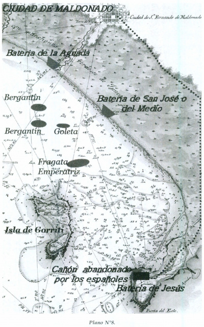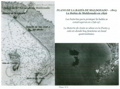 Es importante señalar que en la Bahía de Maldonado en los años 1796 - 1797 se habían construido, por los españoles, tres baterías para la defensa de la bahía. una de las baterías se había emplazado en la Punta del Este, enfrente a la Boca Chica. Dicha batería llevaba el nombre de Batería de Jesús. Esta batería ya no existe y en su lugar está ubicado un local gastronómico. (Ver Plano nº 3 b).