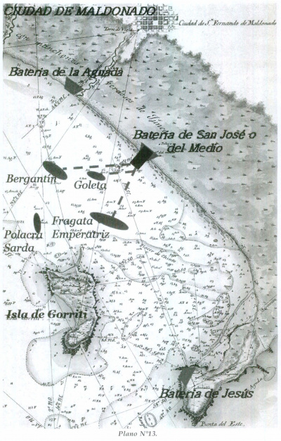 "Día 5 / ... -el tiempo se calma- se hicieron todas las requisiciones / posible para obtener alguna pólvora, todos mostraban / el mayor interés en encontrar algún recurso para / obtenerla con la prontitud deseada, y se embiaron / chasques á S.n Carlos, y p.r las inmediaciones -se / desarmó la pieza se retiró de la batería y la cureña se / trajo a la Ciudad. Los buques enemigos tenían sus / embarcaciones menores en el agua, una de ellas se / dirigió para el Leste, como para desembarcar en la / batería, y me dirijí adonde estaba la lancha, q.e con / solo este movimiento se retiró, tirándome algunos / fusilasos, y dos tiros con un pedrero. A medio día no / se havía conseguido mas pólvora que para un tiro, y / entonces concebí el proyecto, de en la noche, abordar / una polacra Sarda que estaba en el puerto fondeada / entre un bergantín y la fragata imperial, suponiendo / que devía encontrar en su bordo alguna pólvora este / proyecto se lo comuniqué al Coronel Olivera, y se / tomaron todas las providencias para ponerlo en práctica / en la noche. Se mandó por el Coronel, según mi / demanda, que se condujera á la playa una canoa, que lo / mismo se hiciera con la cureña, y mientras yo con diez / hombres de mis marineros hiba abordo de la polacra se / montase la pieza en la batería á las diez de la / noche todo marchó para abajo, y yo salí de la playa en / la canoa para abordo del Sardo, cuyo buque abordé á las once, apesar de que havía levantado un fuerte / viento del Sud. Solamente encontré setenta libras de / pólvora, que compré y dose fusiles, con los que / regresé a la batería, sin ser sentido de los imperiales, / á pesar de haver pasado muy inmediato." (Ver Plano nº 13).