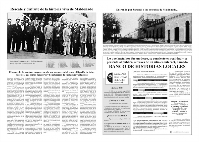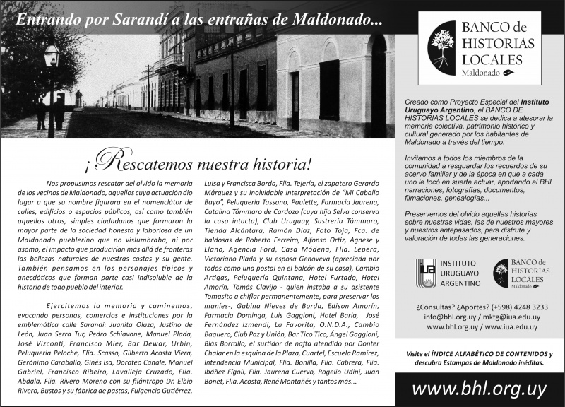 Creado como Proyecto Especial del Colegio I.U.A., el BANCO DE HISTORIAS LOCALES se propone preservar del olvido aquellas historias sobre nuestras vidas, las de nuestros mayores y nuestros antepasados (personas, comercios e instituciones), para disfrute y valoración de todas las generaciones. Dedicado a atesorar la memoria colectiva (narraciones, fotografías, documentos, filmaciones, genealogías), patrimonio histórico y cultural generado por los habitantes de Maldonado a través del tiempo, invitamos a todos los miembros de la comunidad a resguardar en el BHL los recuerdos de su acervo familiar y de la época en que a cada uno le tocó en suerte actuar.